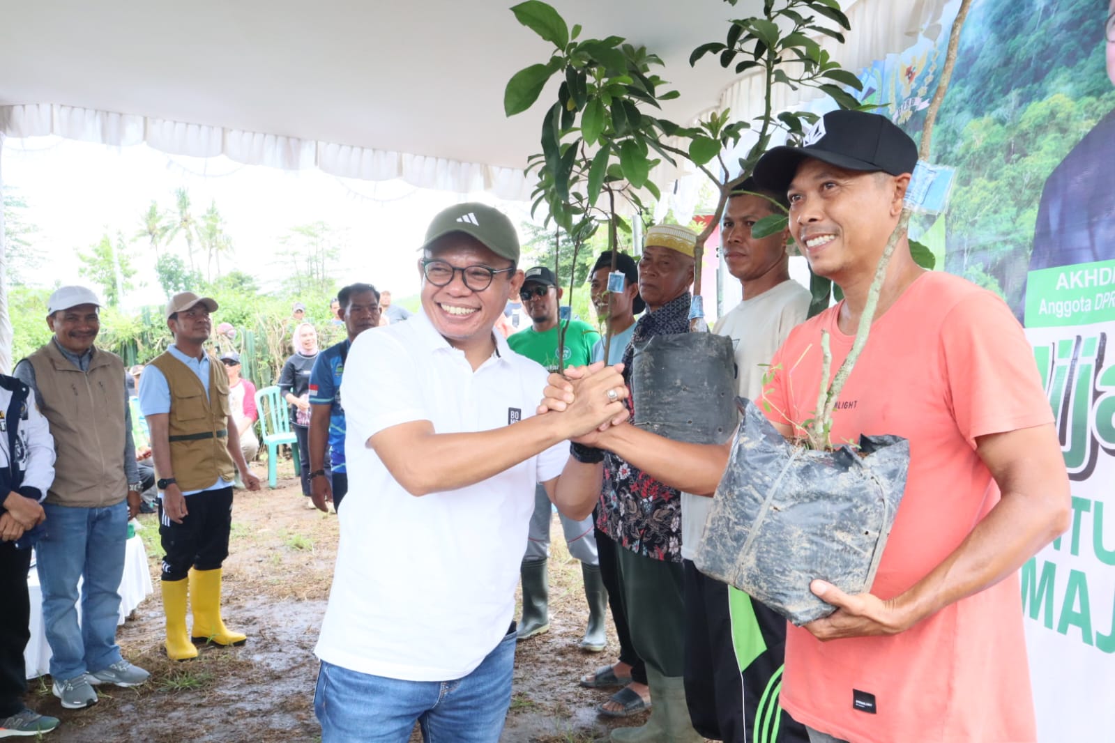 Akhdiansyah, SHi, anggota DPRD Provinsi NTB fraksi PKB dari Dompu menyerahkan secara simbolis bibit pohon buah kepada perwakilan kelompok untuk ditanam di Desa Dorebara Kecamatan Dompu, Jumat (28/11/2025).