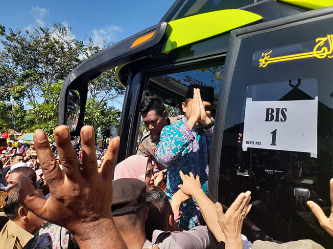 Kader Jaelani yang didampingi Lilis Suryani, istri tercinta yang duduk di kursi depan Bus PO Dunia Mas dan ikut mengantar hingga Asrama Haji Mataram ini juga memohon do’a selruh masyarakat Dompu semoga seluruh jamaah calon haji Dompu dapat menjalankan ibadah haji dengan baik dan sempurna. “Mohon doanya untuk kami dan juga buat daerah kita ini,” tambahnya.