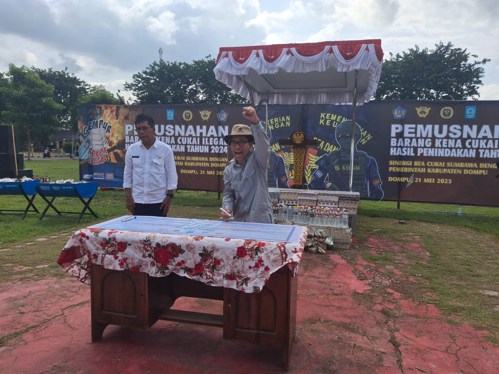 Ketua DPRD Dompu, Ir Muttakun memberi semangat sebelum menandatangani komitmen memberantas rokok illegal pada acara pemusnahan Baran Kena Cukai (BKC) illegal di Dompu, Rabu (21/5/2025) pagi.