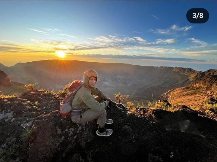 Nadiem Makarim saat menikmati keindahan di puncak gunung Tambora dan membelakangi kawah raksasanya.
