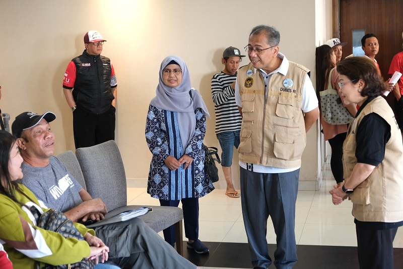 Dubes Ubaedillah (tengah, berkacamata) dan Ibu Siti Rif’ah Ubaedillah (tengah, berjilbab), didampingi Counsellor Wita Purnamasari (paling kanan) menyapa WNI yang sedang menunggu antrian pelayanan pada Kegiatan Pelayanan Terpadu di Kuala Belait Brunei Darussalam pada 12 November 2023 (Foto: Koordinator Fungsi Penerangan, Sosial, dan Budaya KBRI Bandar Seri Begawan)