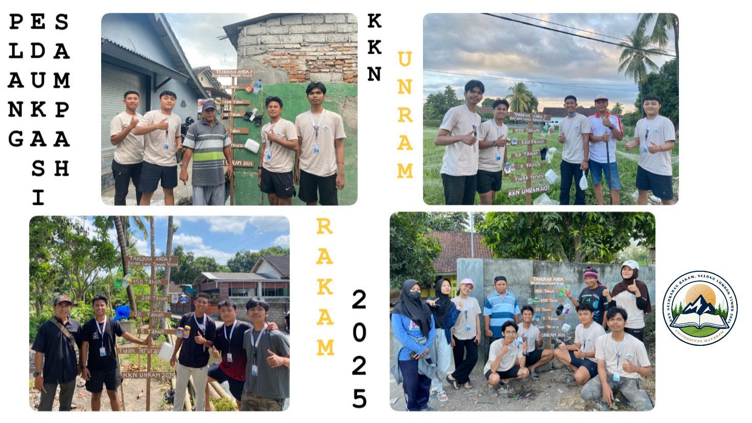Mahasiswa Kuliah Kerja Nyata (KKN) Universitas Mataram (Unram) di Kelurahan Rakam, Selong, Lombok Timur membuat plang edukasi sampah untuk dipasang di setiap lingkungan. Ditemani oleh Kepala Lingkungan dan RT setempat, pada hari Sabtu tanggal 2 Agustus 2025 dan juga pada hari Selasa tanggal 5 Agustus 2025, mereka turun memasang plang edukasi sampah yang mereka buat.
