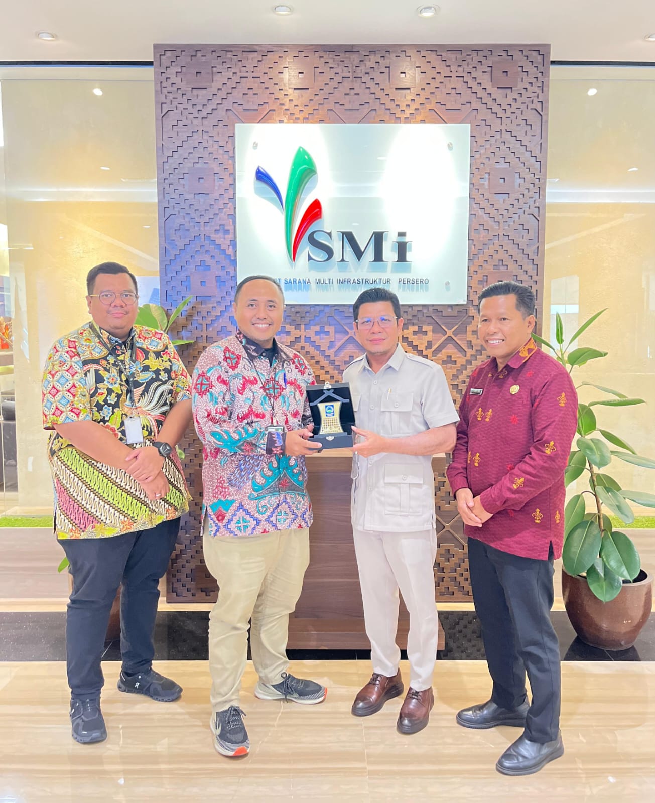 Bupati Dompu, Bambang Firdaus, SE menyerahkan cinderamata lambang daerah Kabupaten Dompu kepada perwakilan PT SMI Persero di Jakarta pada Selasa (11/11/2025).