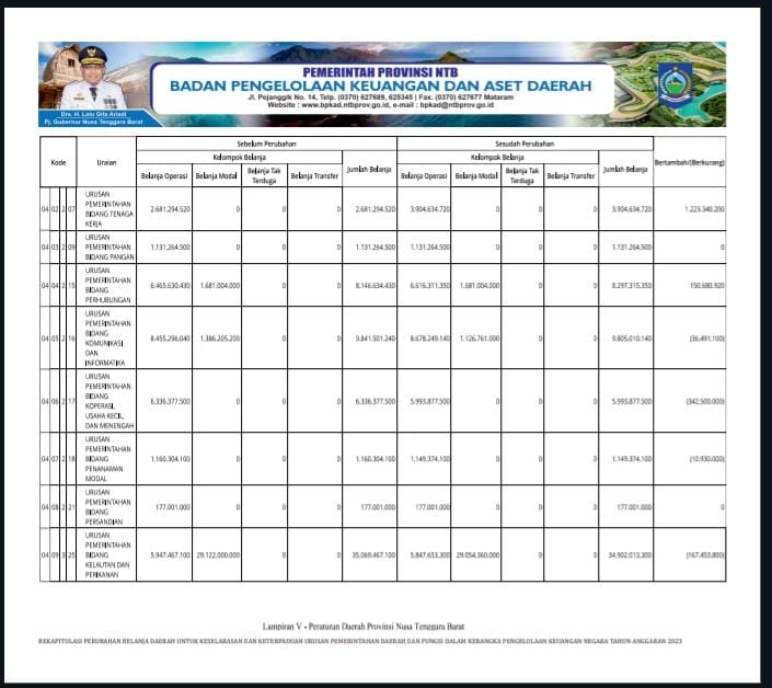 Berita ini menjadi bagian dari pengumuman Perubahan APBD Provinsi NTB tahun anggaran 2023 sesuai lampiran II Perda No 4 tahun 2023 tanggal 19 Oktober 2023 yang dimuat melalui media massa www.insanchannel.com. (02ic/*)