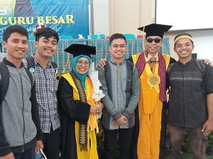Duo profesor yang foto bareng dengan mahasiswanya usai pengukuhan sebagai guru besar